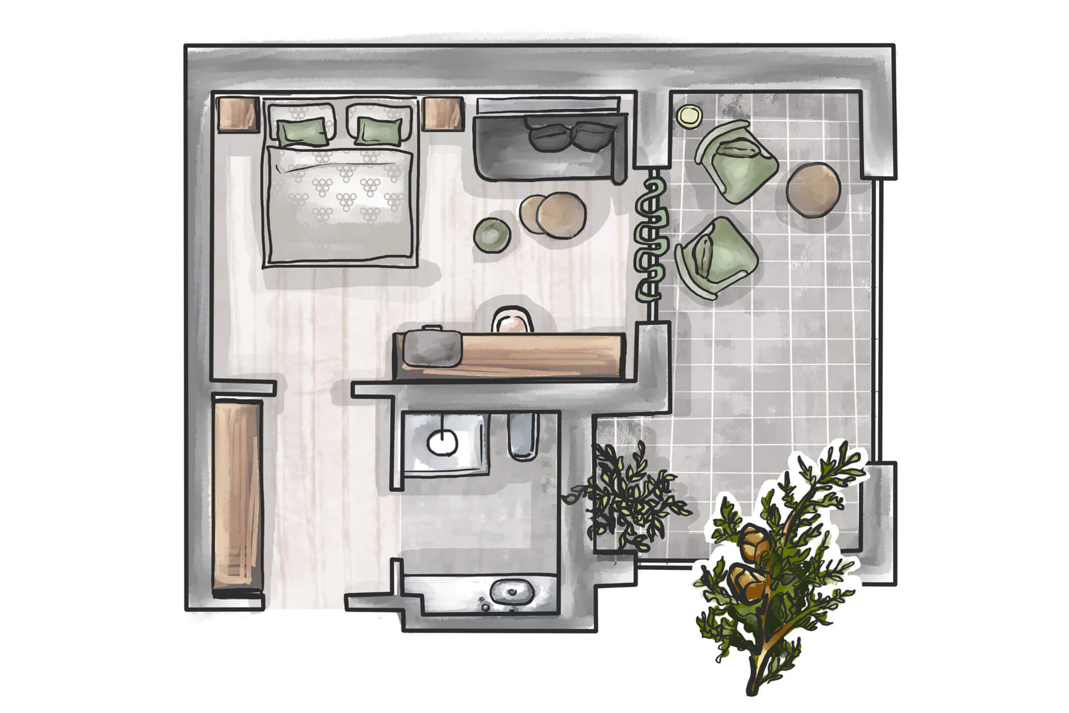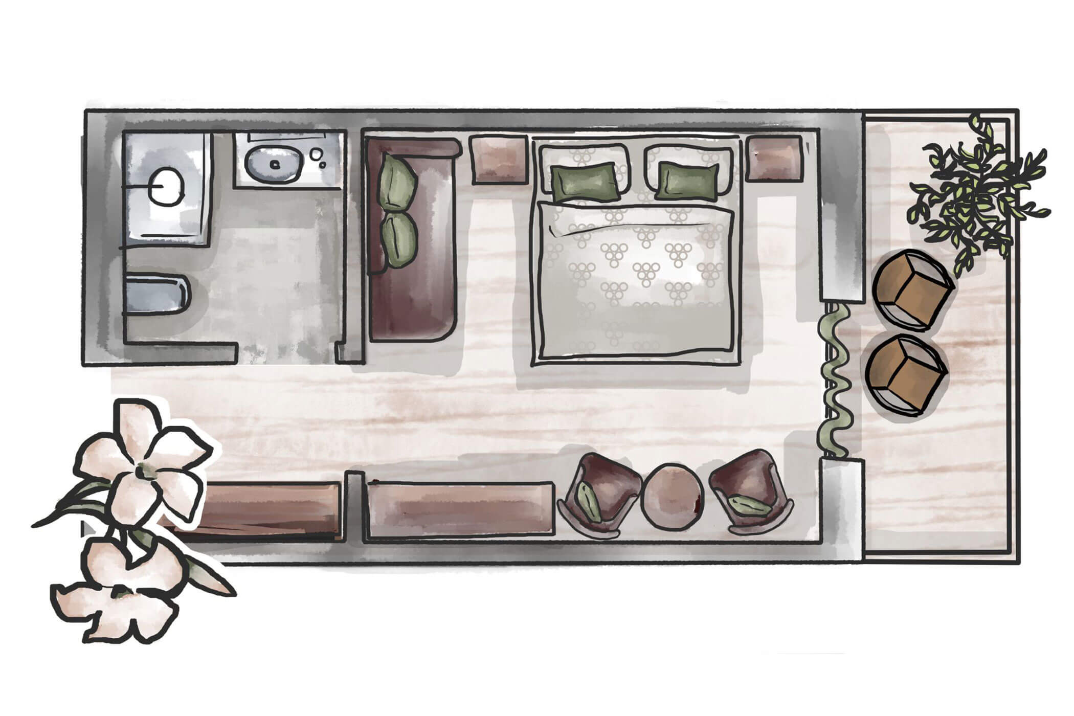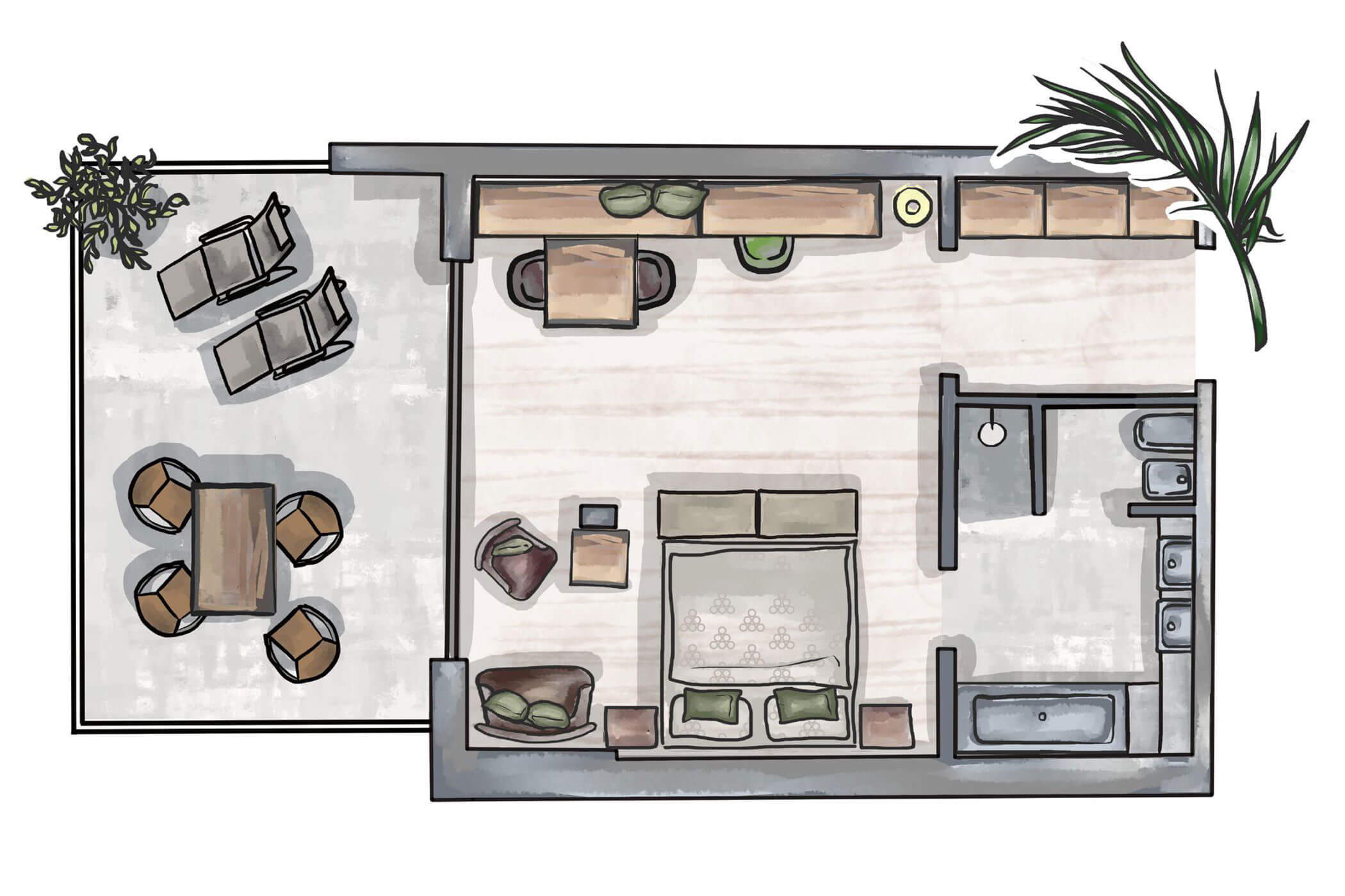 Warm natural tones, olive ash, and a clear layout – Suite Olivea combines timeless elegance with functional comfort. The separate sleeping and living areas make it a retreat for those who enjoy generous space.