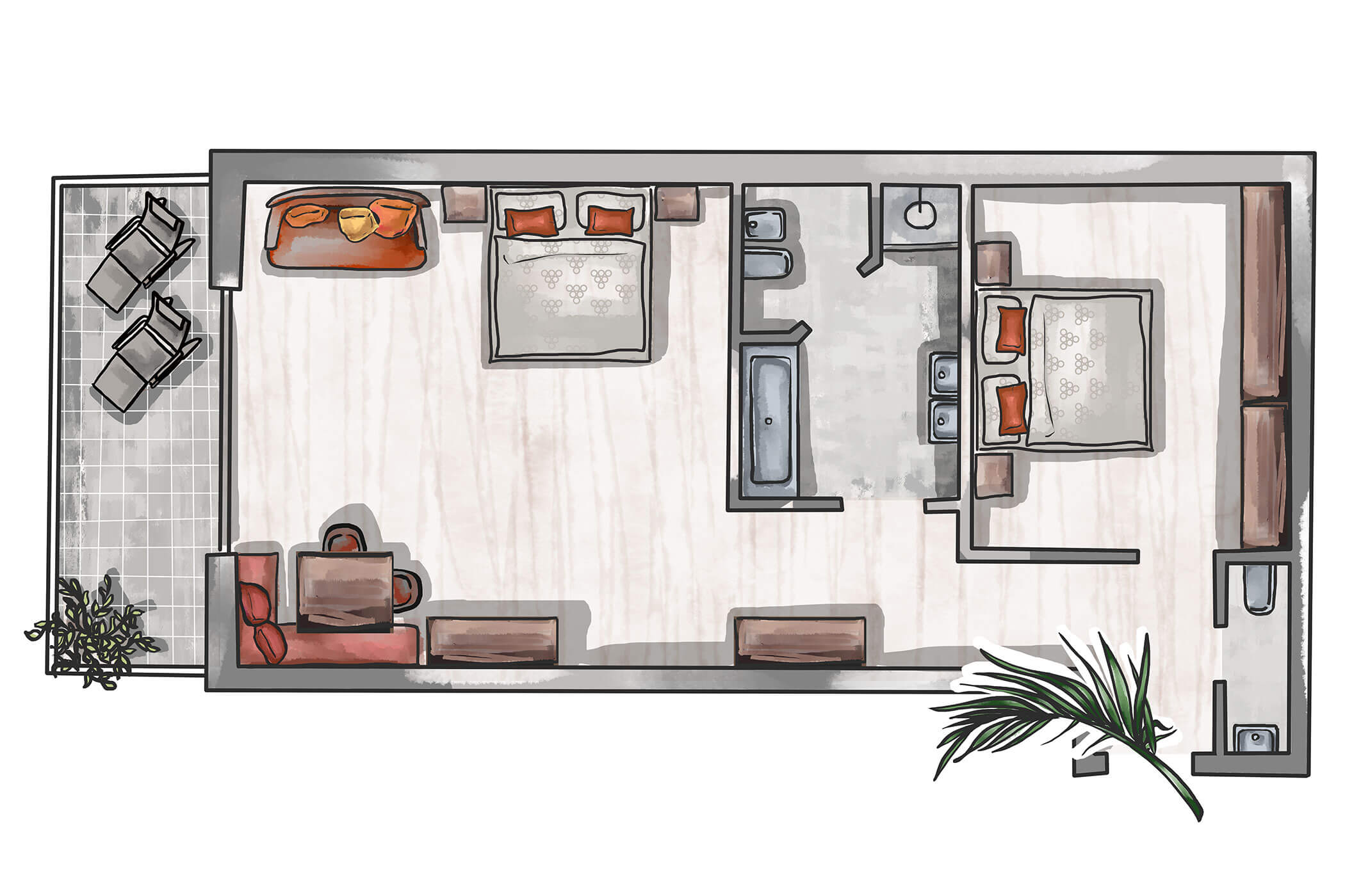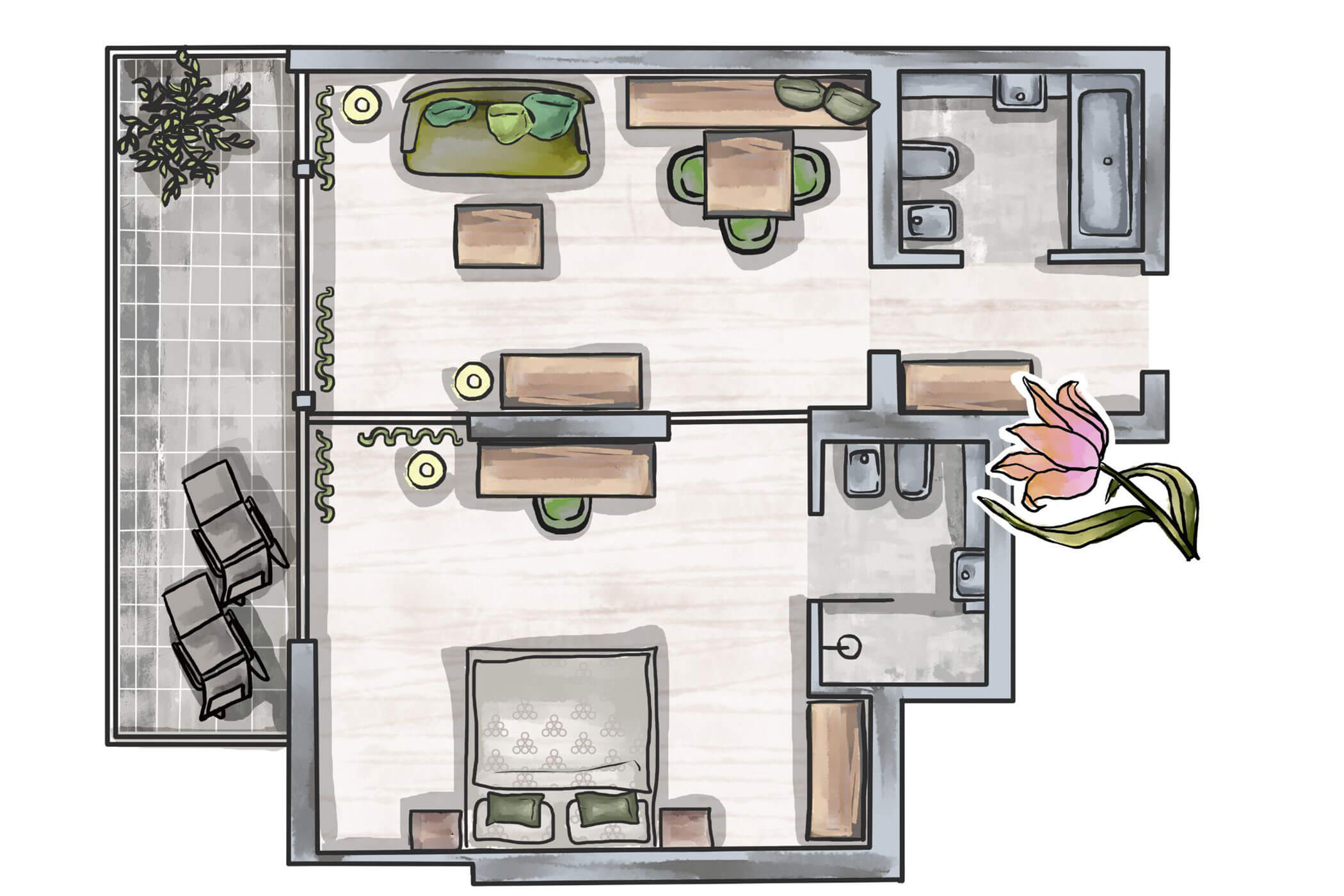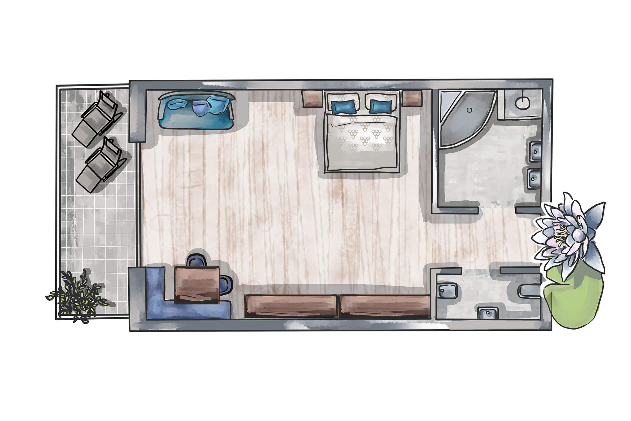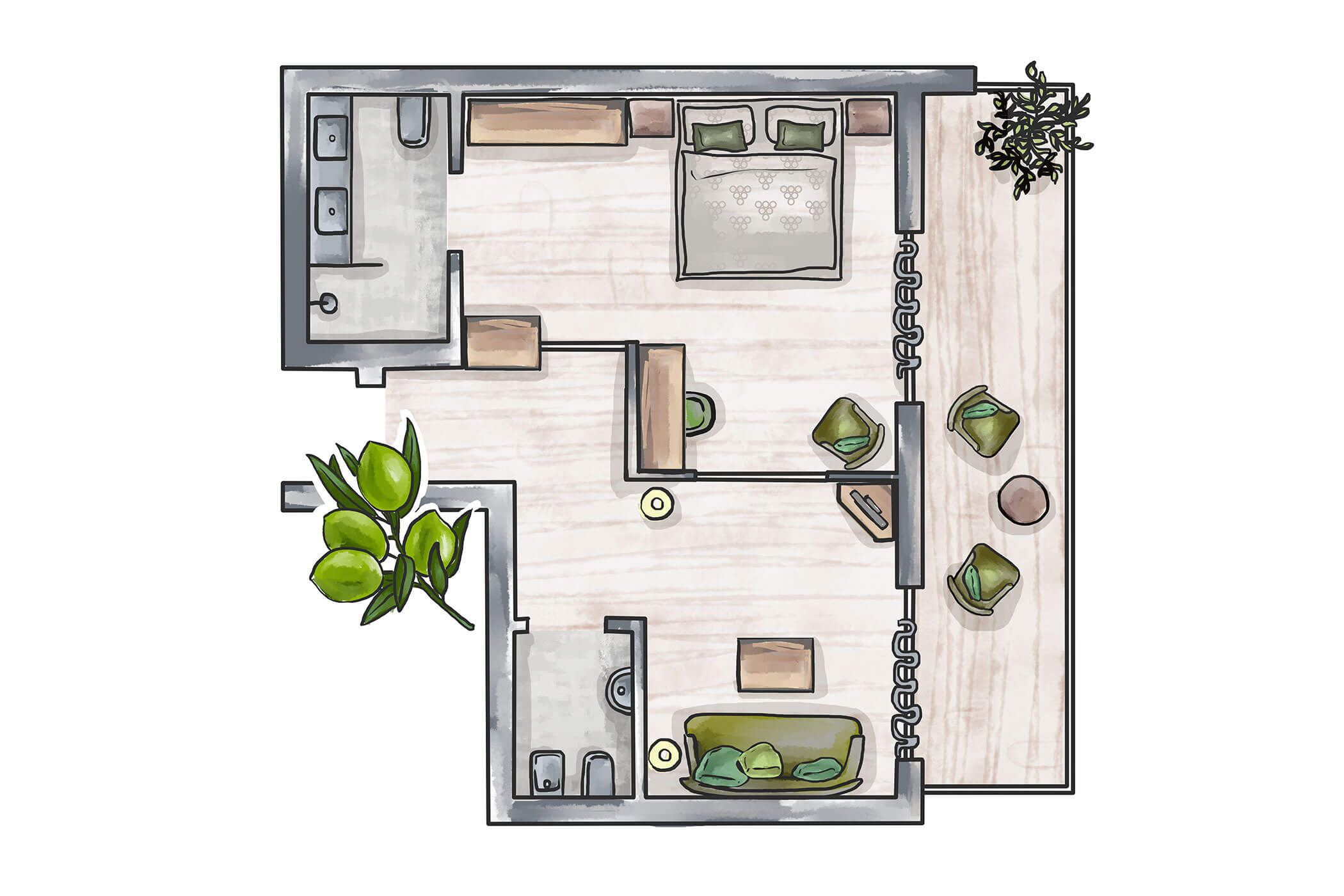 Warm natural tones, olive ash, and a clear layout – Suite Olivea combines timeless elegance with functional comfort. The separate sleeping and living areas make it a retreat for those who enjoy generous space.