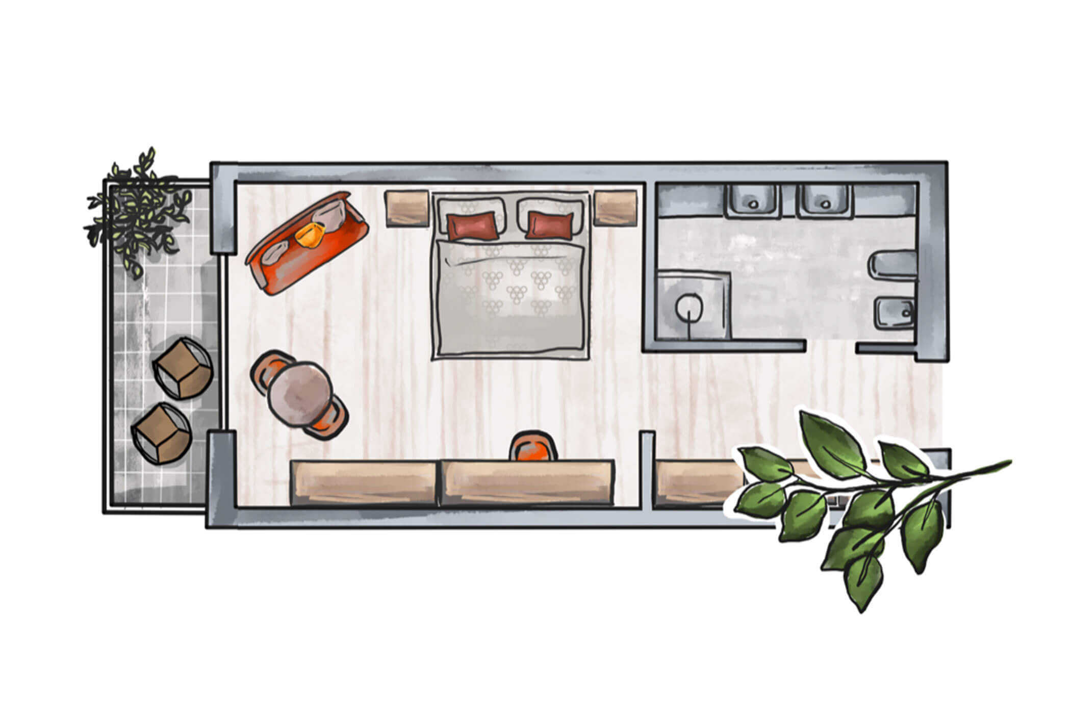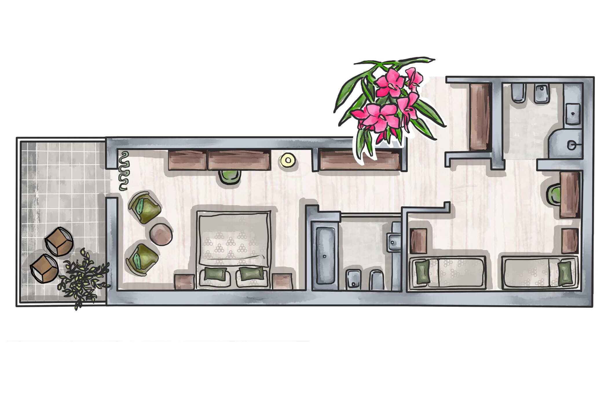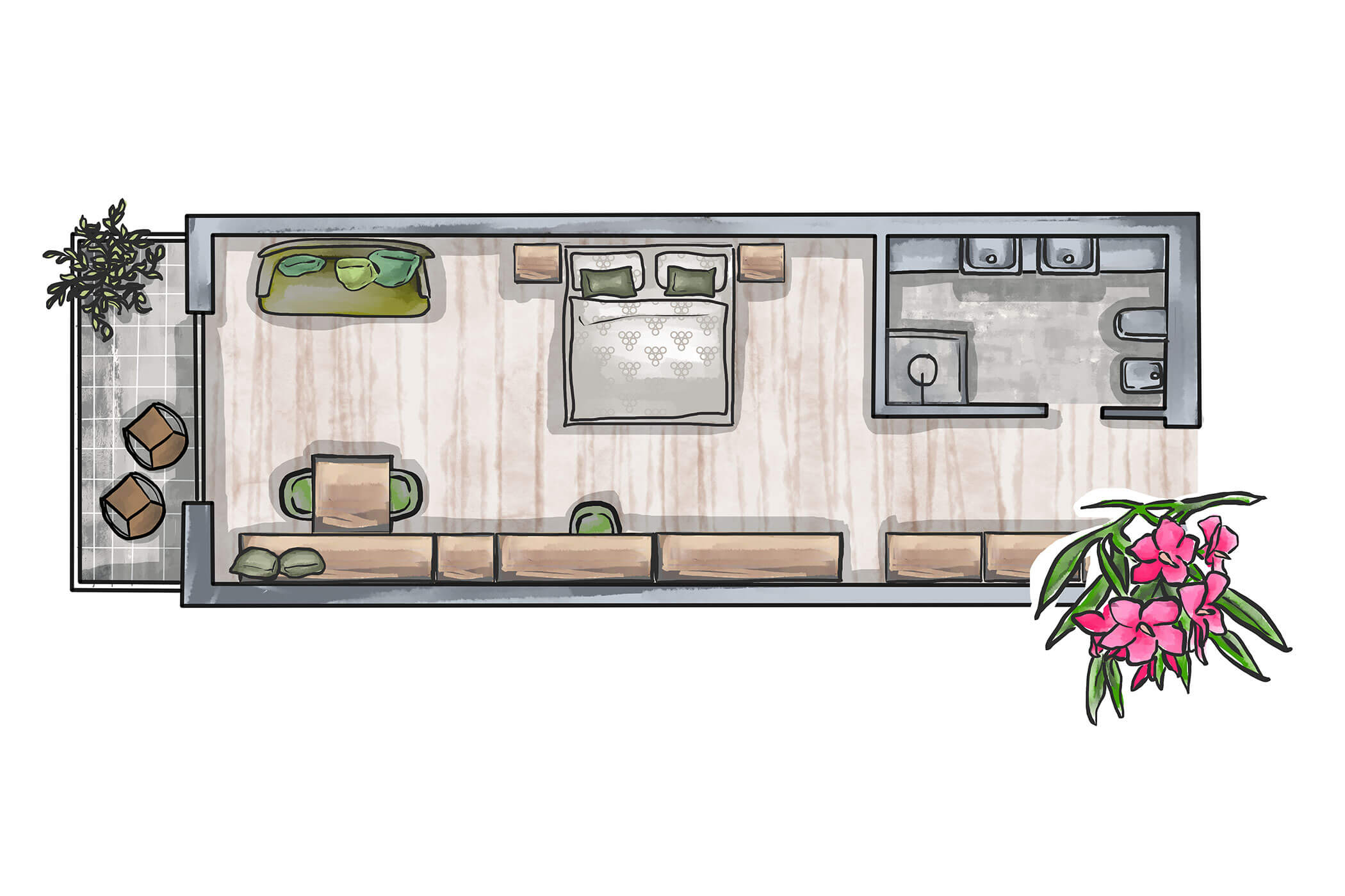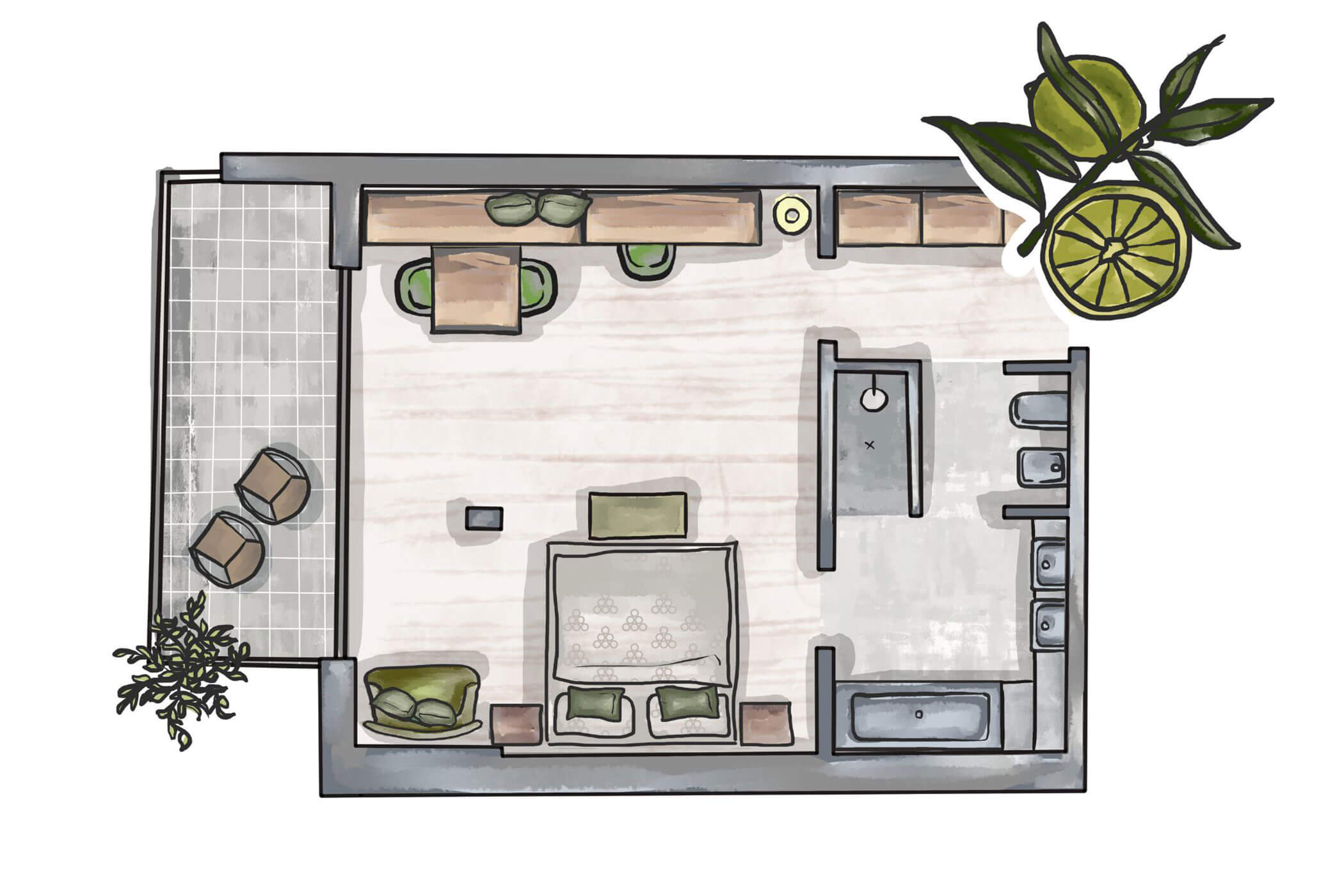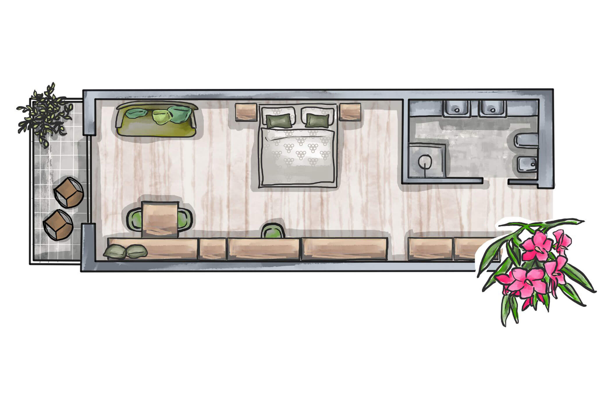 Quietly located by the olive garden and decorated with great attention to detail – this double room combines southern lightness with homely comfort. Warm colours, natural materials, and the green outlook make it the perfect retreat for sun-lovers and connoisseurs.