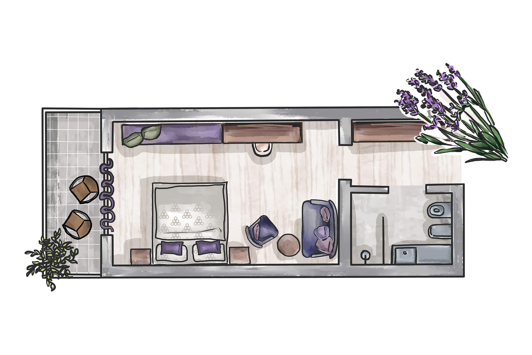 Modern design, natural materials, and a touch of lavender – this peaceful room on the mezzanine floor lies right beside the olive grove and invites you to unwind.