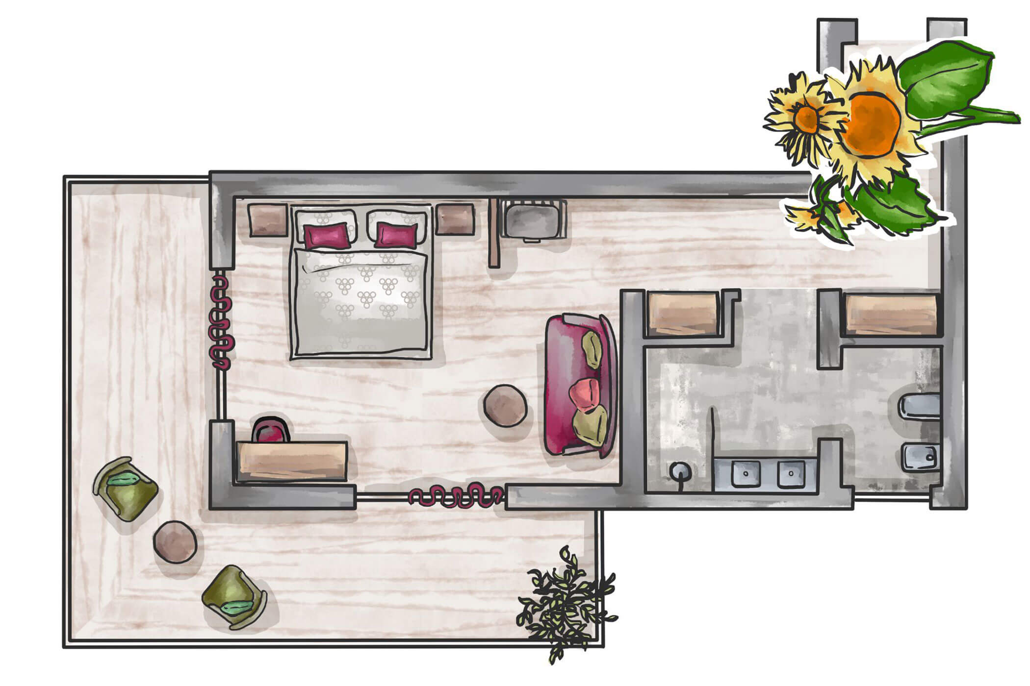 A retreat with character: olive ash wood, warm fuchsia and mocha tones, and a corner balcony with panoramic views create a sense of space and security in this suite.